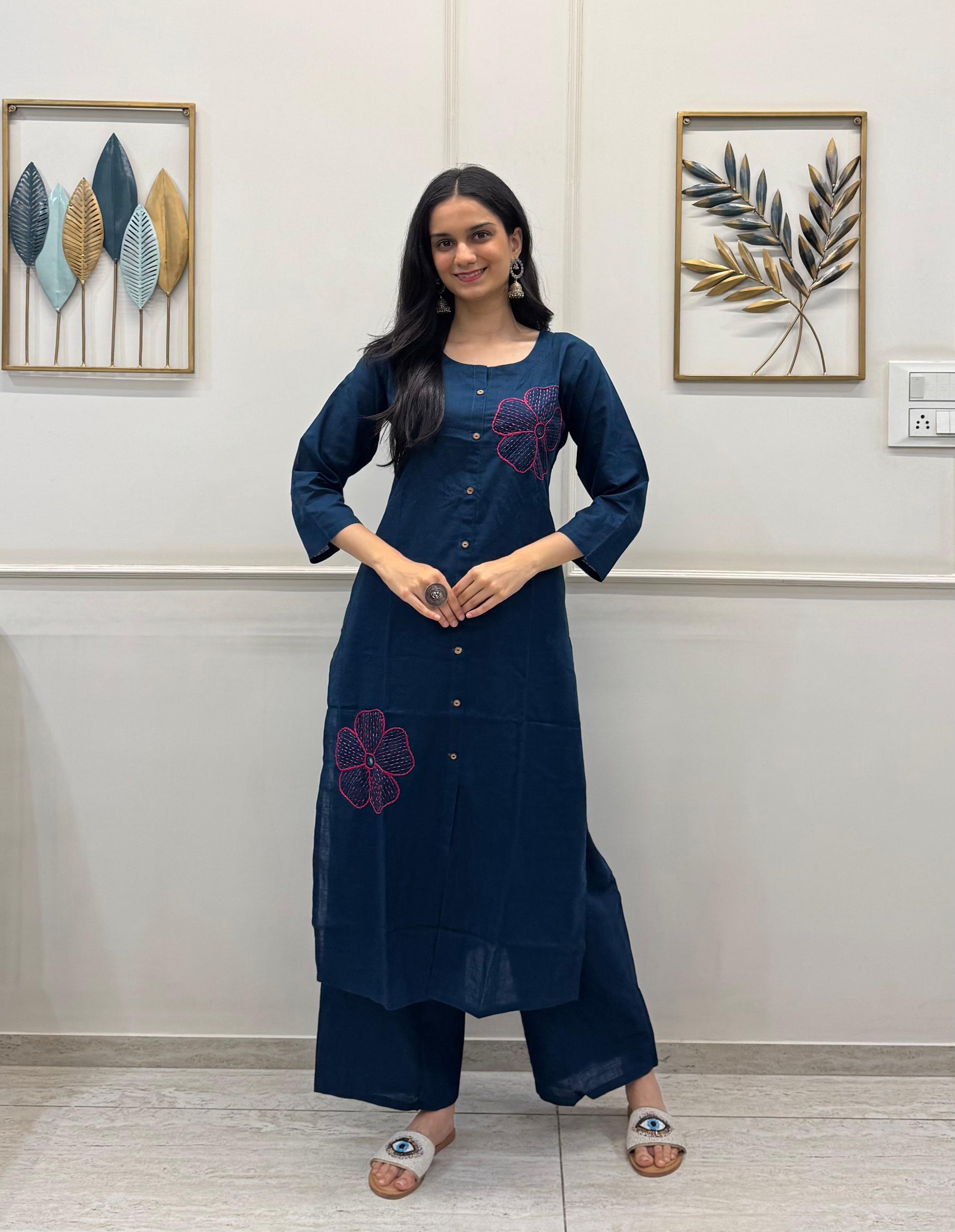 Deep Navy Blue Cotton Kurta Set Adorned With Hand Embroidery Floral Motifs.