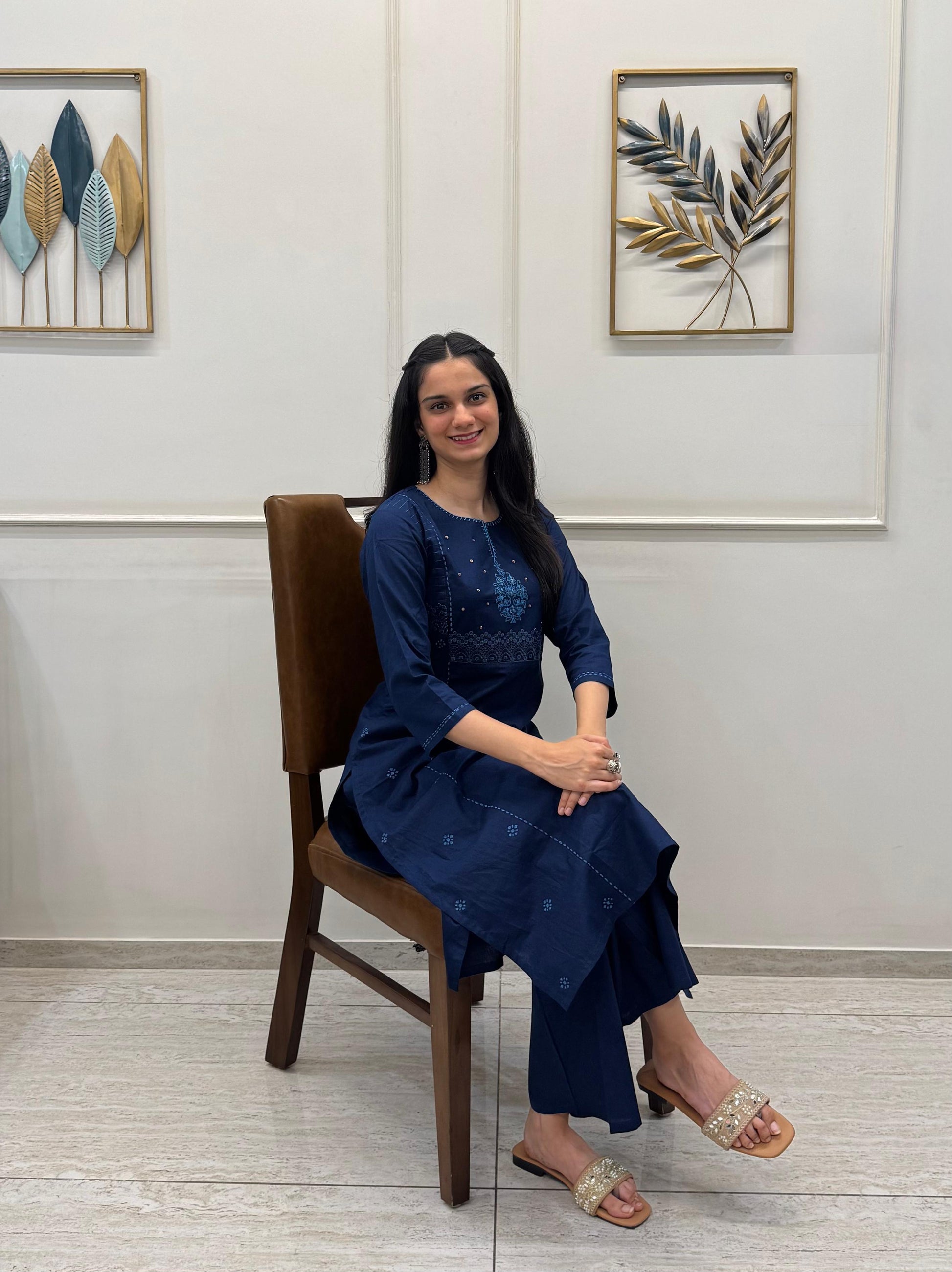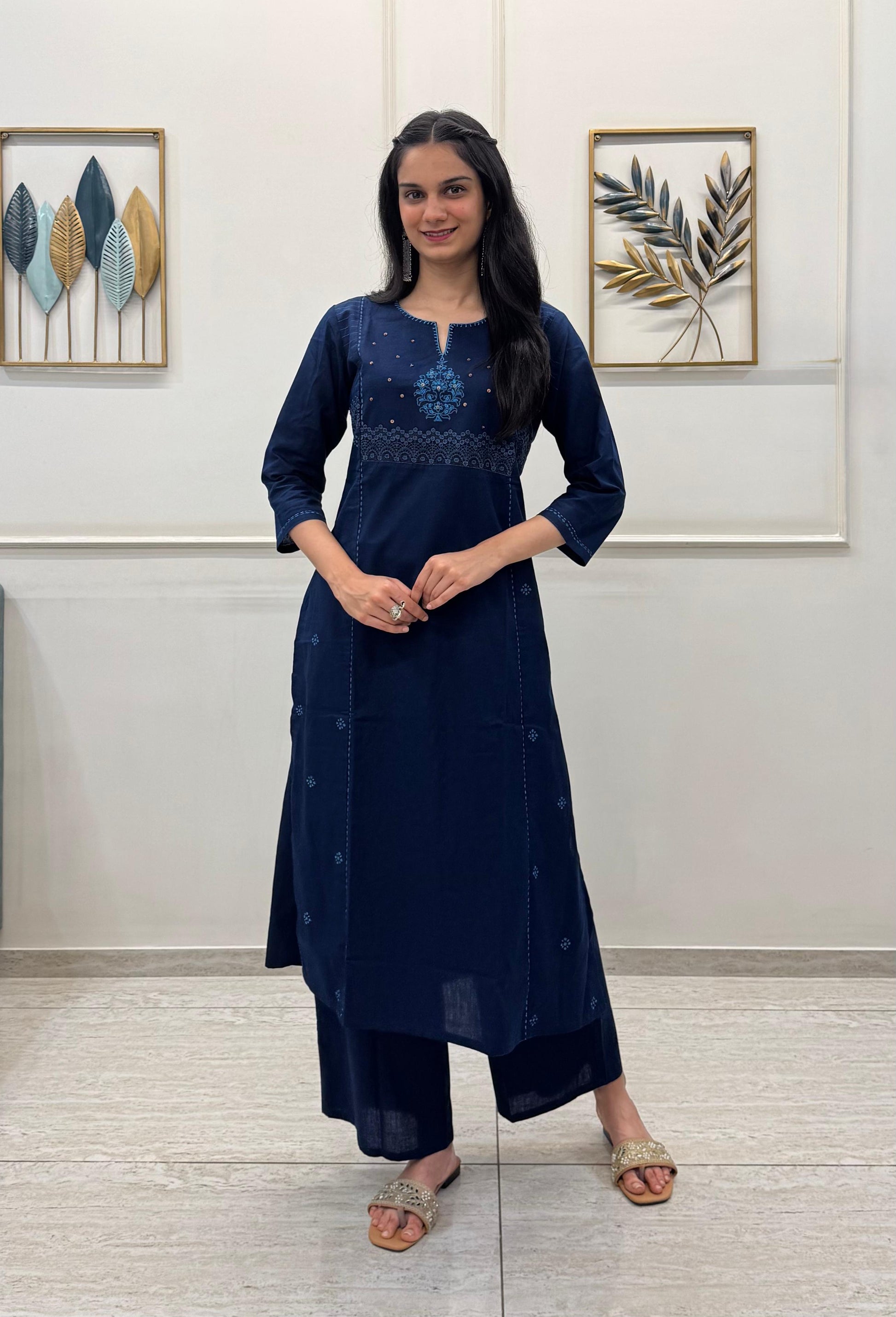 Deep Navy Kurta Set Crafted In Soft Organic Cotton With Block Prints, Tiny Sequins, And A Lace Detailed Neckline.