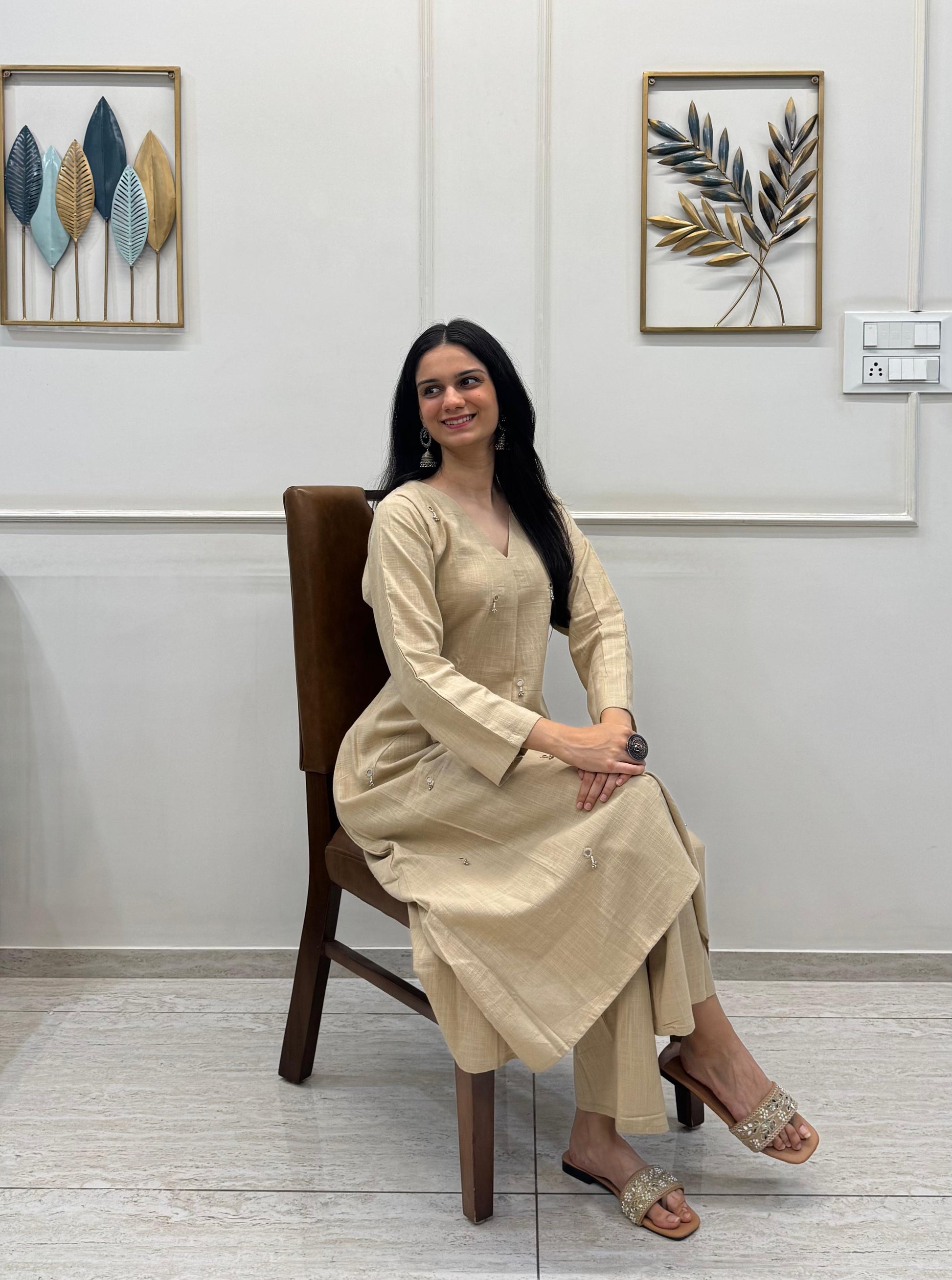 Effortlessly elegant, this Khaki A-Line Kurta Pant Set is crafted from soft, breathable cotton, offering both comfort and sophistication. The subtle earthy tone is beautifully enhanced with hand-done mirror work and dainty tassels, adding just the right touch of festive flair to a minimal silhouette.
