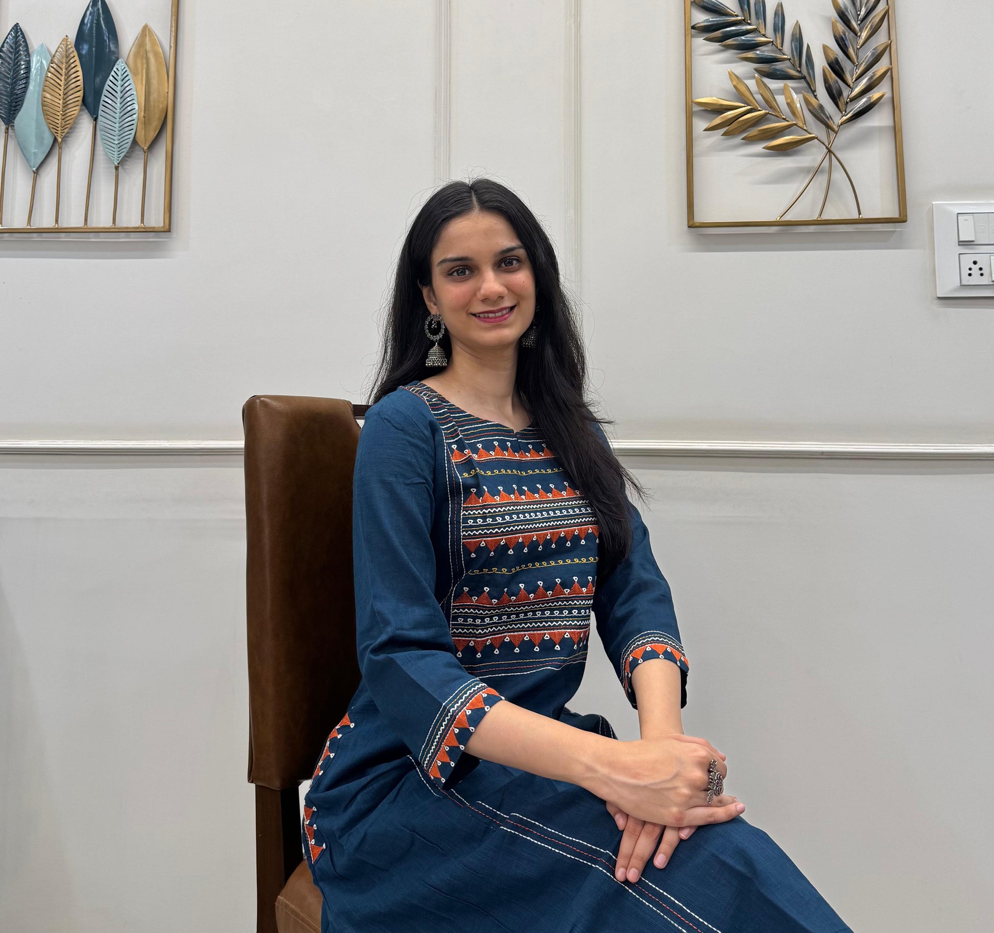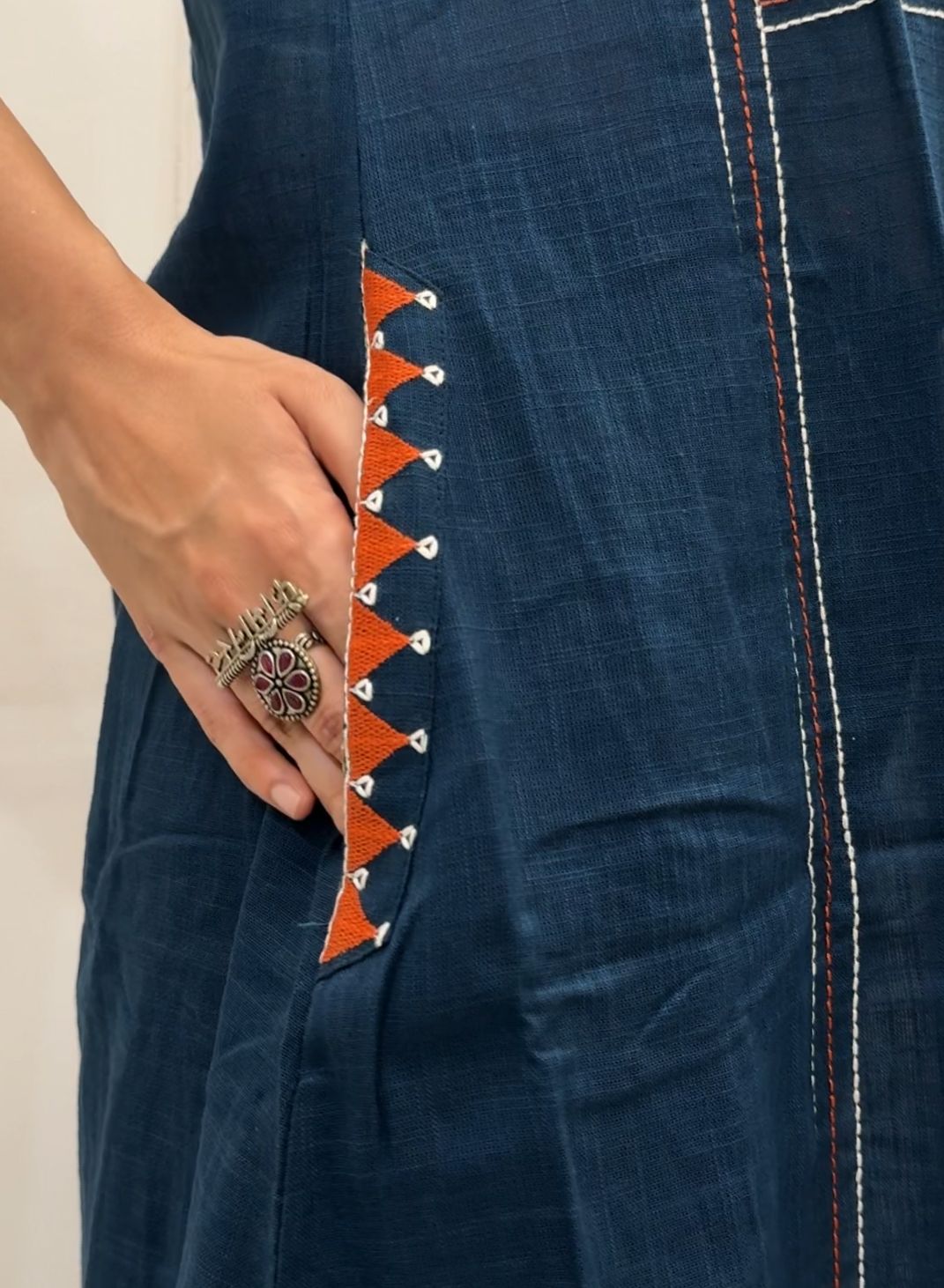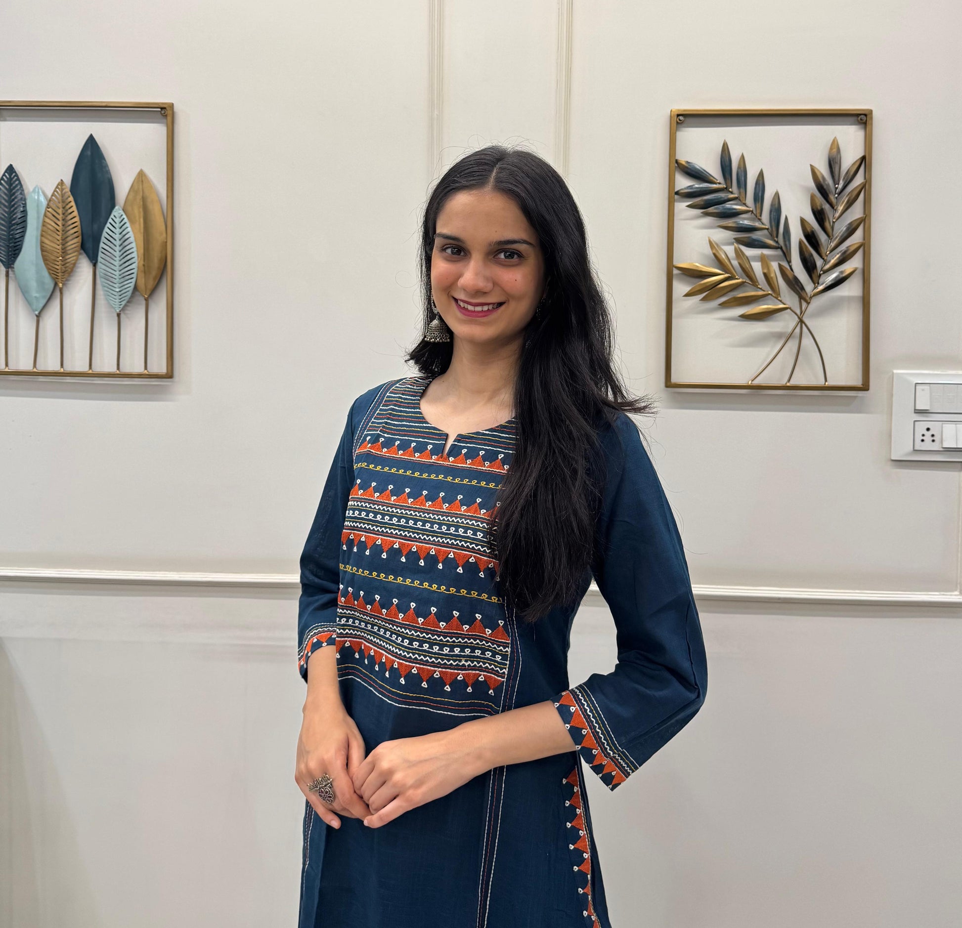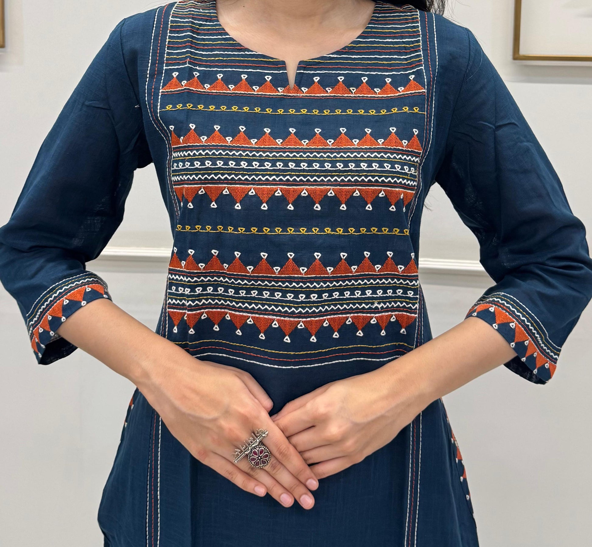 Navy Cotton Kurti Set With Multicolour Embroidery.