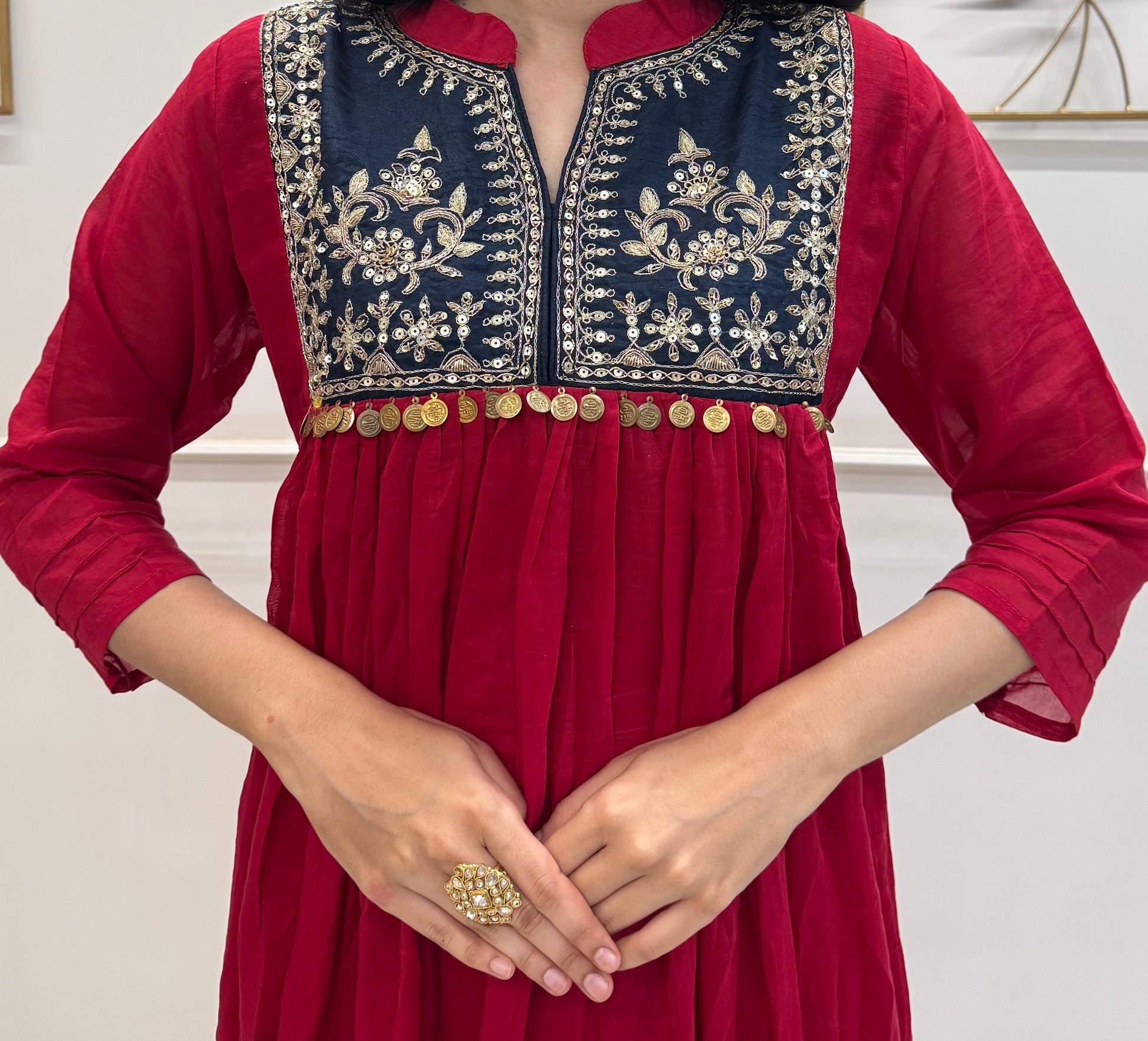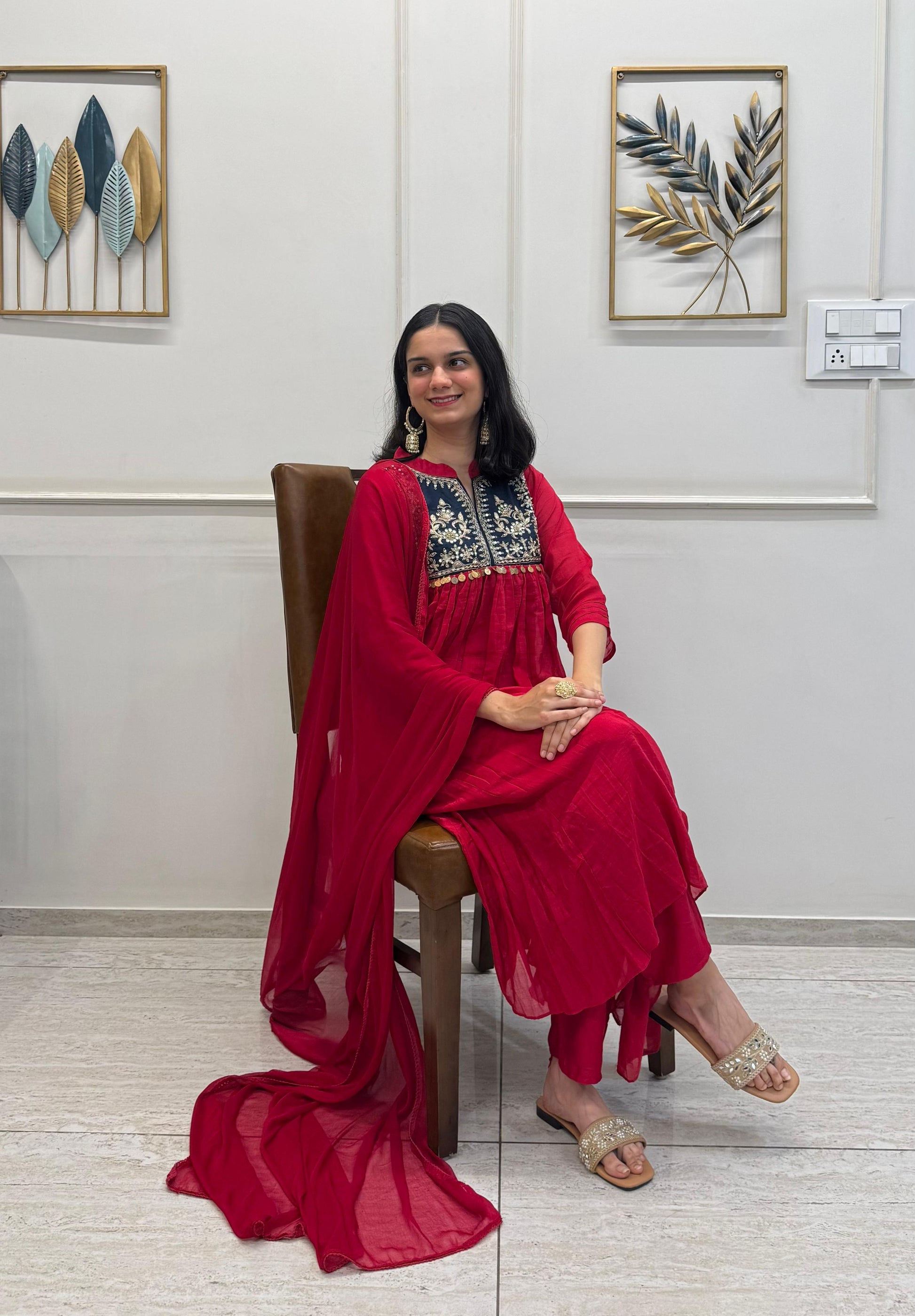 Make a statement in timeless elegance with this Red Mul Chanderi Anarkali Set, a perfect blend of traditional grace and intricate handcrafting. Crafted from soft and flowy mul chanderi fabric, the Anarkali kurta features delicate handwork detailing, paired with comfortable pants and a lightweight dupatta for a complete, regal look.