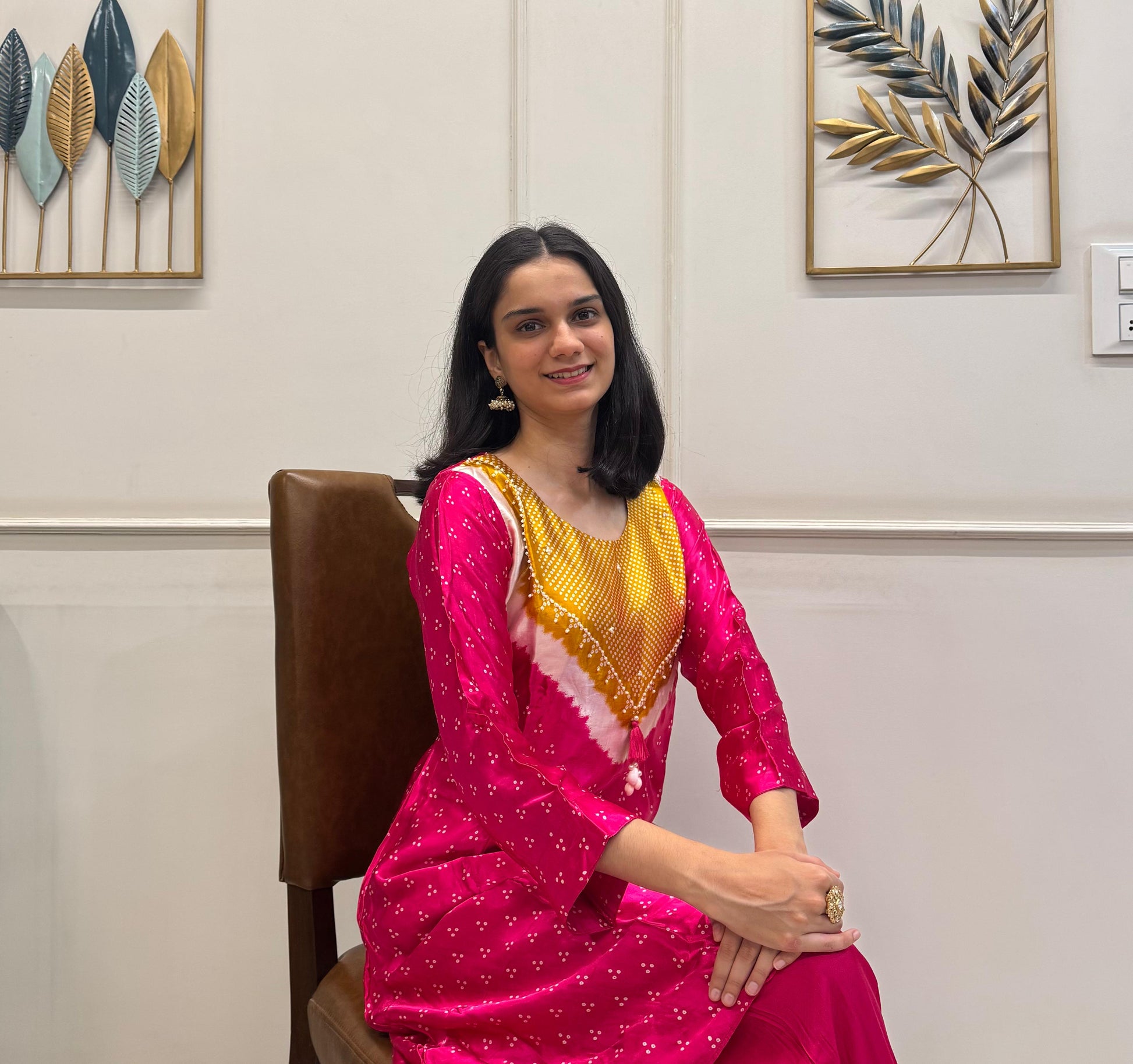 Effortlessly graceful and rooted in tradition, this ensemble is crafted from soft Gaji silk, known for its luxurious drape and smooth texture. Adorned with timeless Bandhani prints, the piece is kept elegantly minimal with subtle detailing — letting the heritage print and rich fabric take center stage.