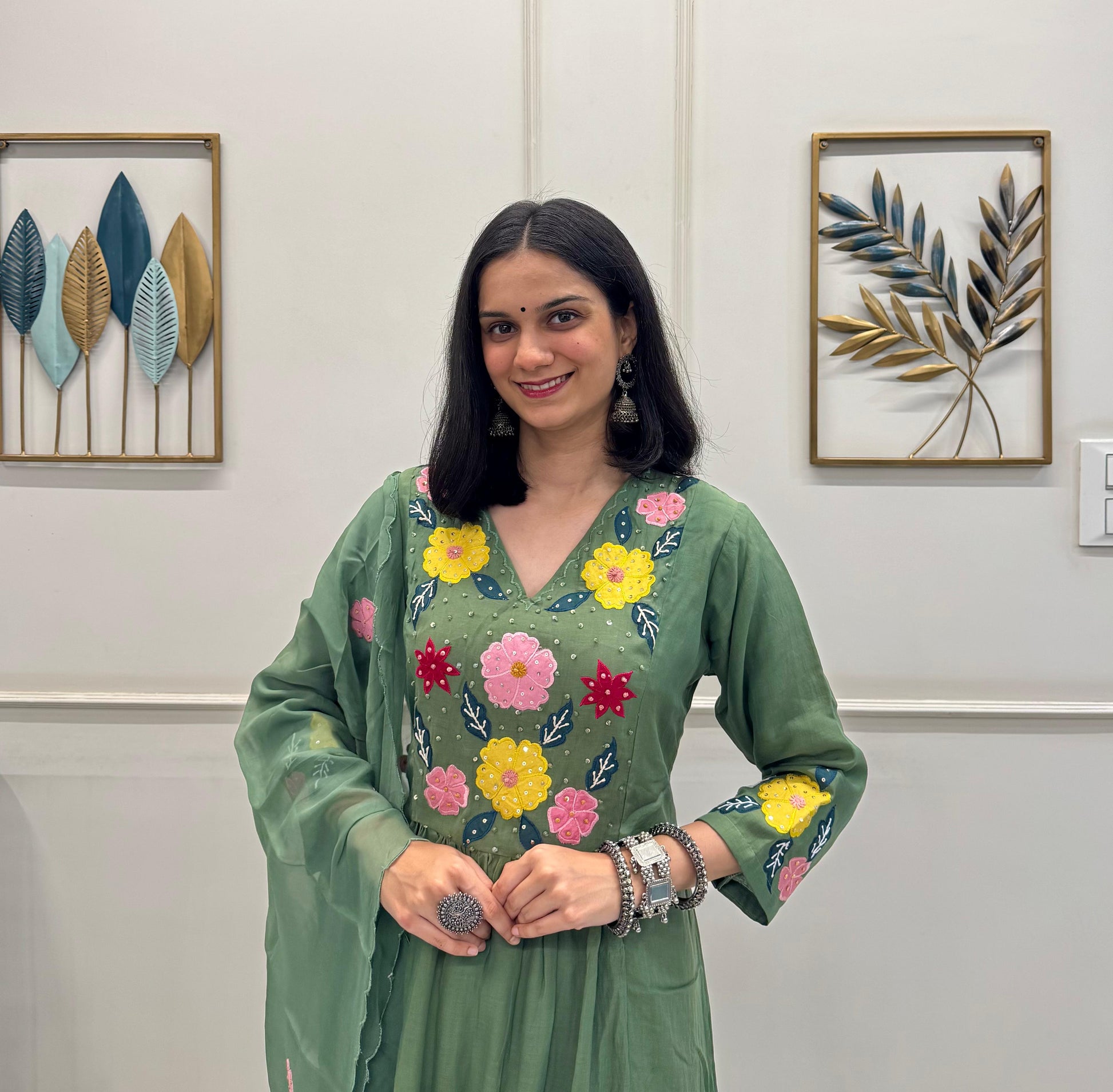 Soft Green Mul Chanderi Kurta Pant Dupatta Set With Embroidery Patch Work.